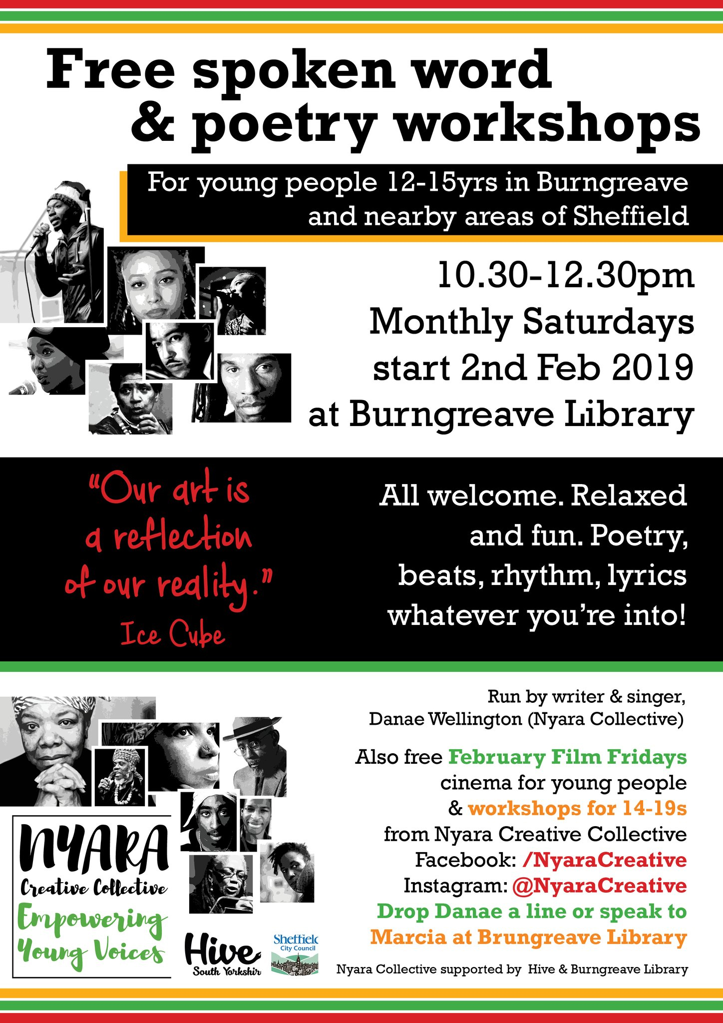 I’m so proud of Danae, a really talented emerging young writer who’s passionate about growing creative opportunities in the community. Danae and another great young writer, Warda Yassin, will also be leading monthly creative writing workshops at the library from 2nd Feb. For more info on both, click on a flyer below, or visit: www.hivesouthyorkshire.com