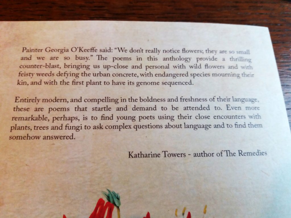 Here’s a sneak peak of the cover of Wild Poetry, the young writers anthology I’ve just edited that we’ll be launching at our open mic on Monday 30th. It really is a beautiful book full of great poems (an ideal Christmas present for a poetry lover or also a plant lover, or both!) We’ll be selling it at the open mic and from our website in November.